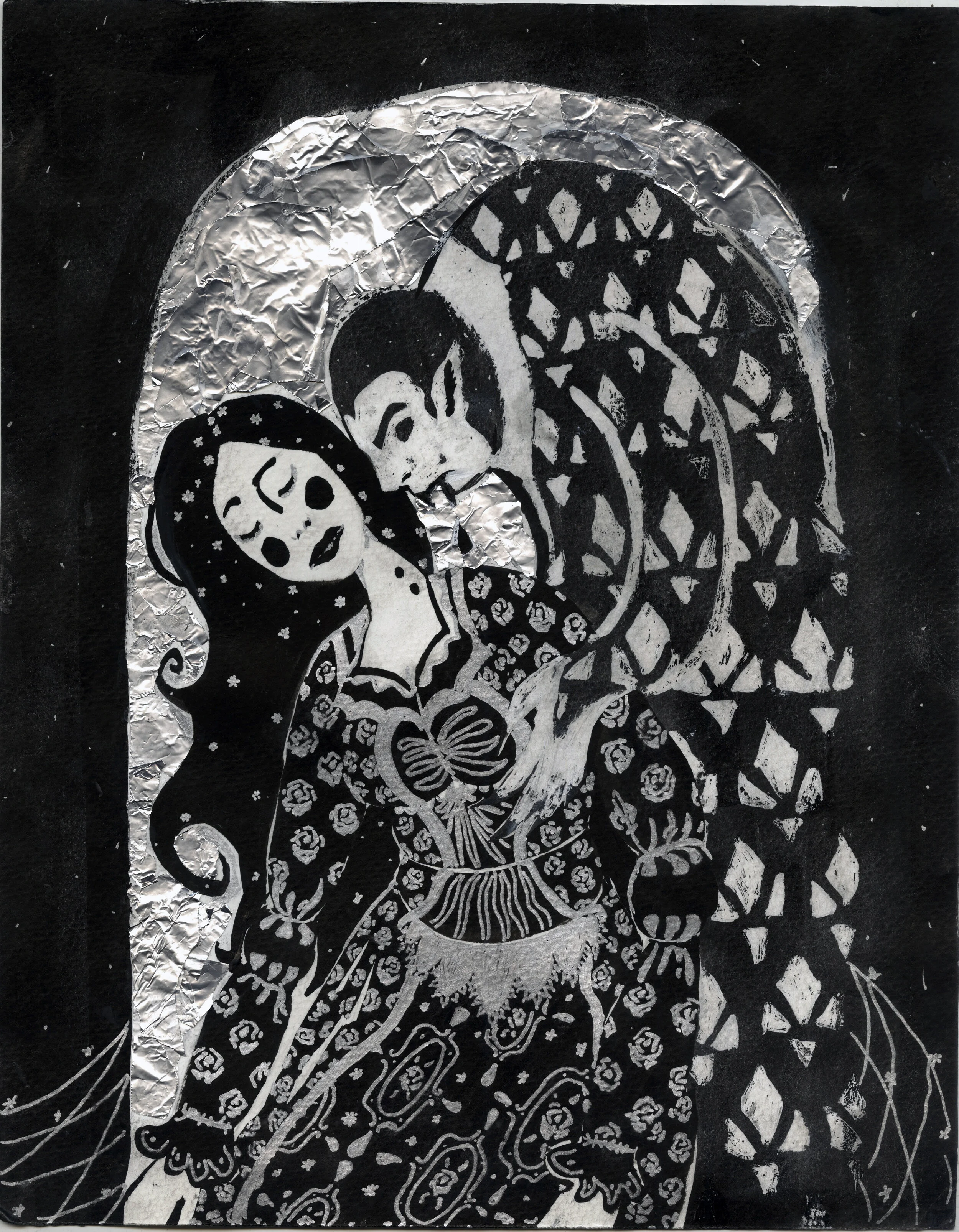 Inspired by Gustav Klimt’s “The Kiss.” Made with ink, metallic marker, gouache resistance and collaged foil.
